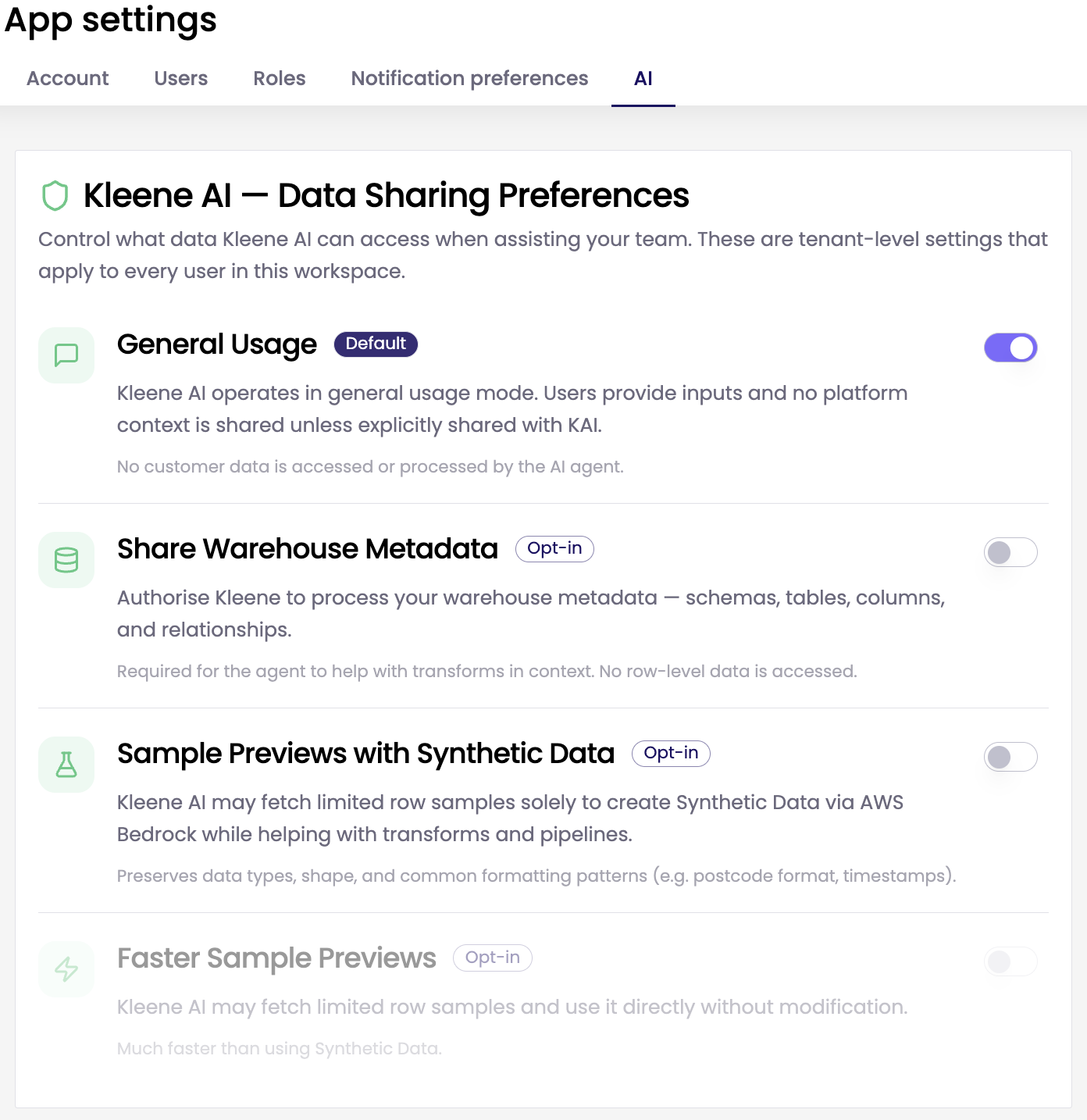 KAI can only access what you enable in the App Settings. You can use the toggles to control access to warehouse metadata and data previews.