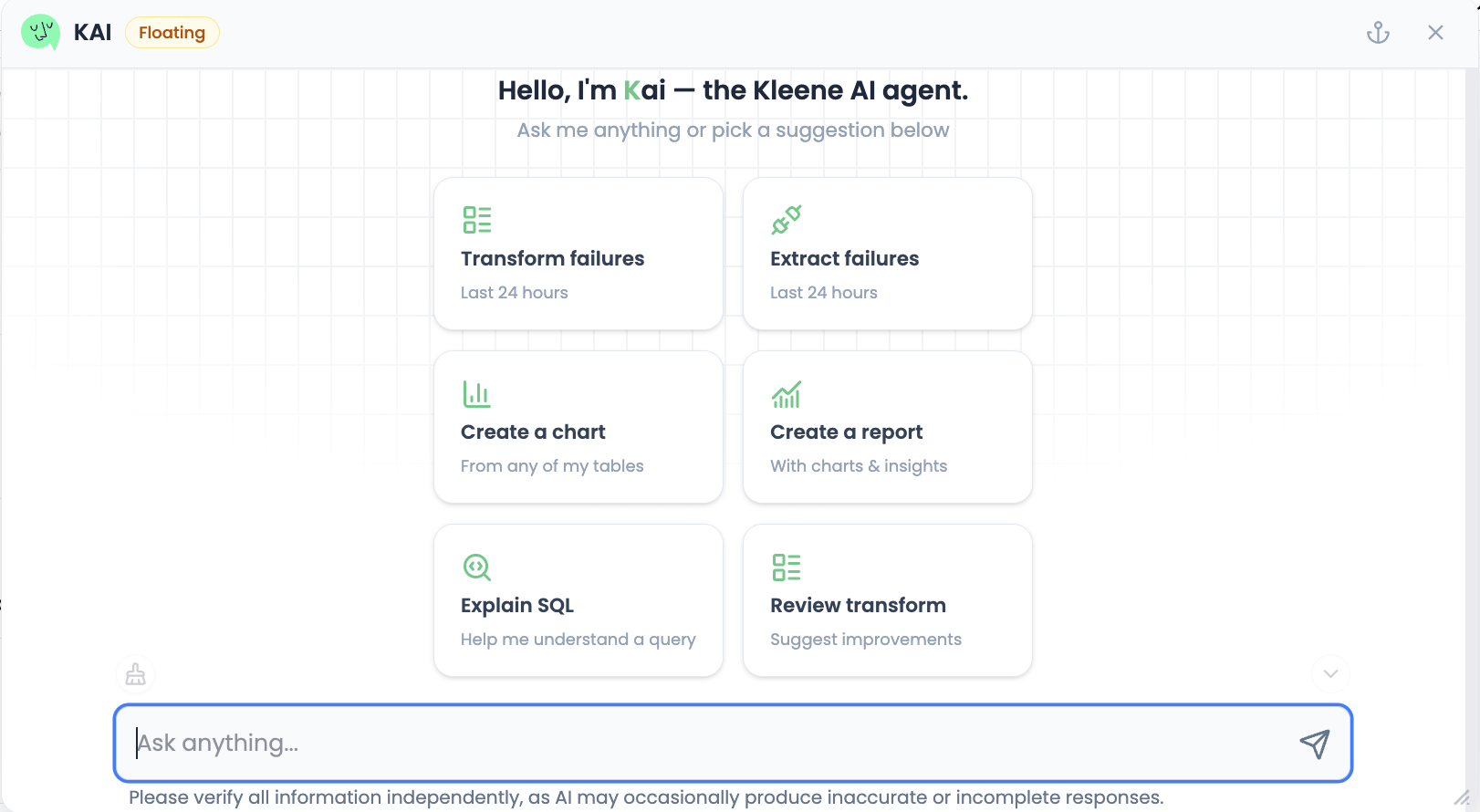 - For transform, group, and log workflows, KAI may send relevant identifiers (e.g. transform names, error messages, and log snippets).