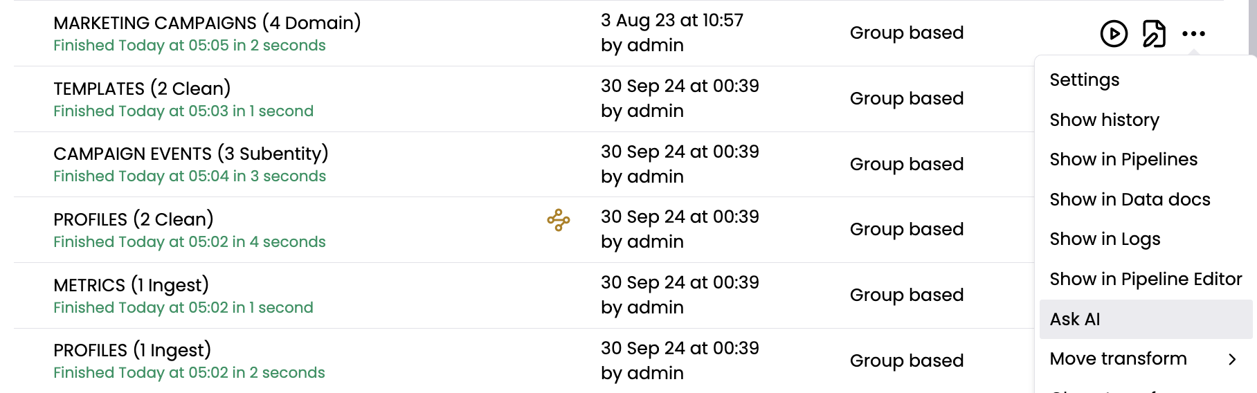 b) Click the ... menu on any transform and select Ask AI. This allows KAI to provide specific responses using the context of that individual transform