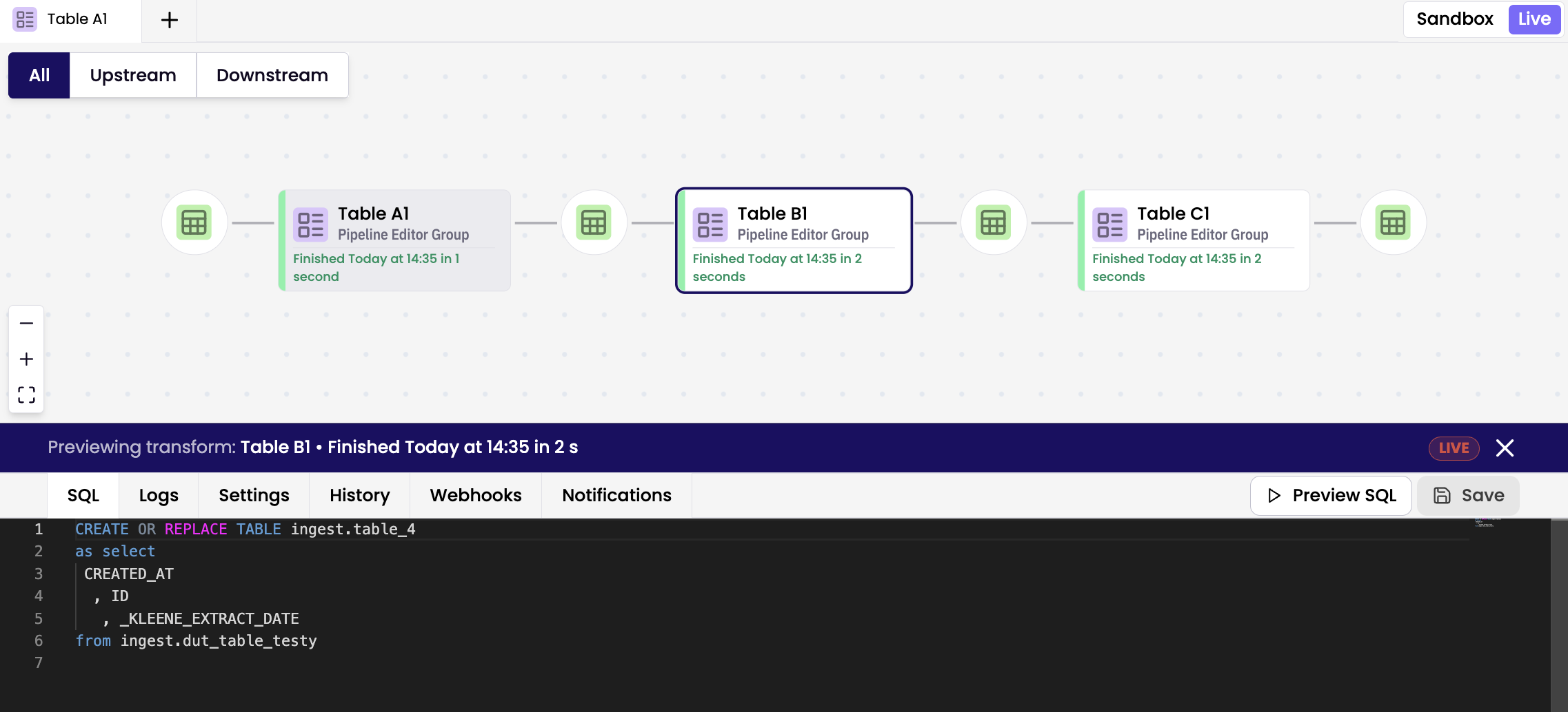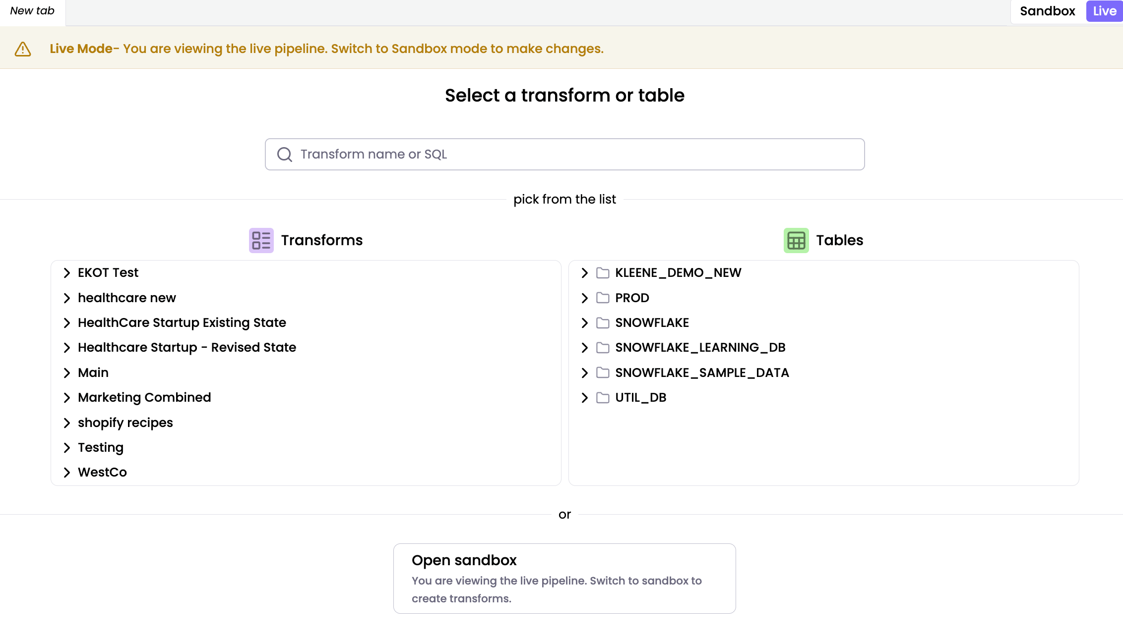 The Pipeline Editor gives Kleene users a clear, end-to-end view of their data pipelines. From high-level lineage to the detailed configuration of any table or transform, it makes it easy to understand how data flows and where it’s shaped. You can edit existing transforms directly in the Pipeline Editor within a safe, virtual workspace called a sandbox. Changes made in the sandbox stay isolated from your live environment until you’re ready to publish them.