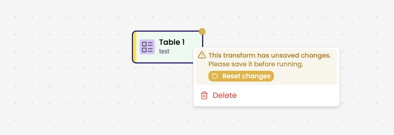 - Sandbox Changes Summary gives you options to open transform in a new tab, undo change, reset your pipeline, stash a new version, or publish changes to live using the commit button. Commits can be executed by admins or users with edit permissions. Tables are visible in the Pipeline Editor after running it in the Transforms page.